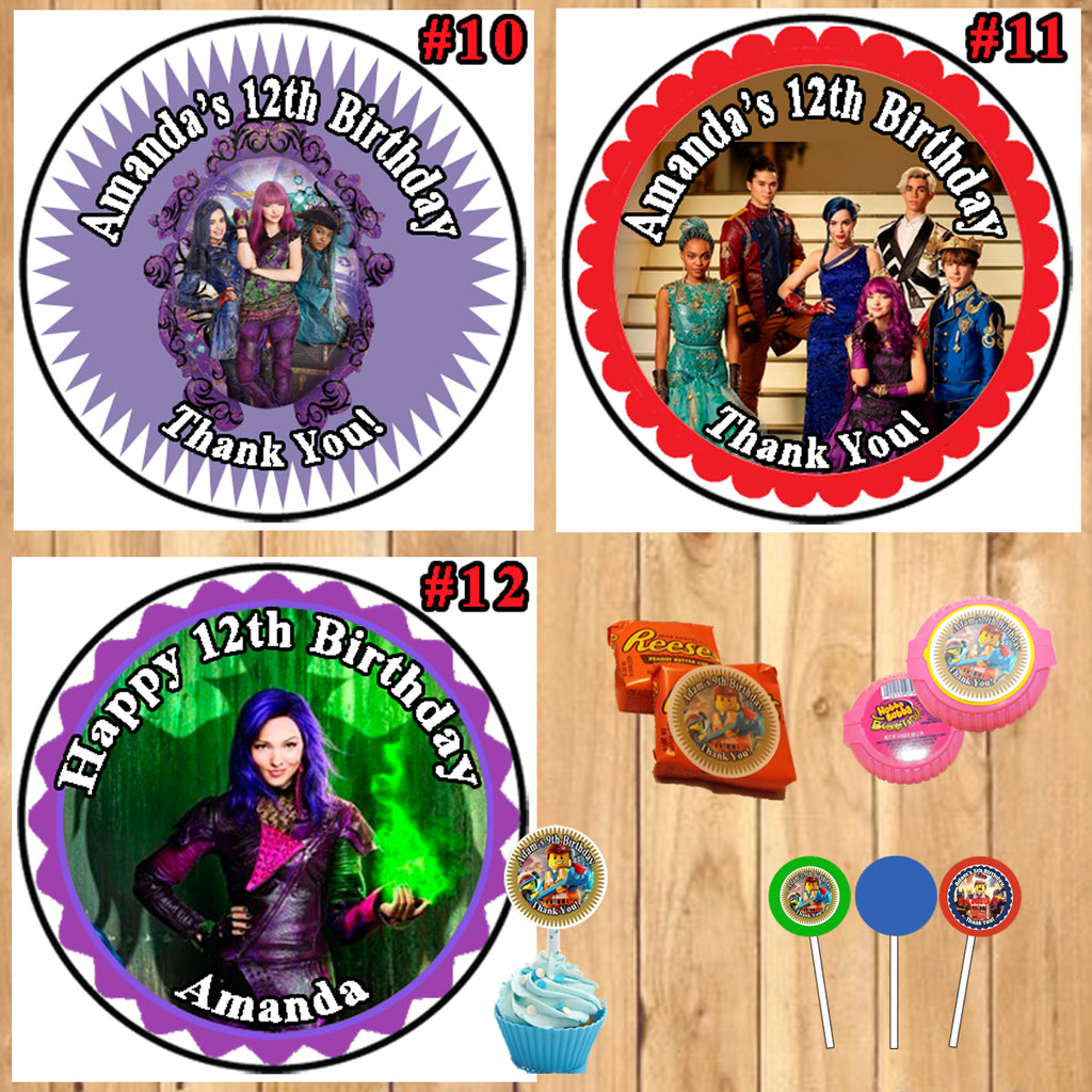 Descendants Birthday Round Stickers Printed 1 Sheet Cup Cake Toppers Favor Stickers Personalized Custom Made